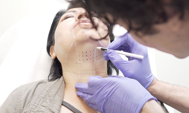 Kybella is injected strategically in small amounts beneath the chin.